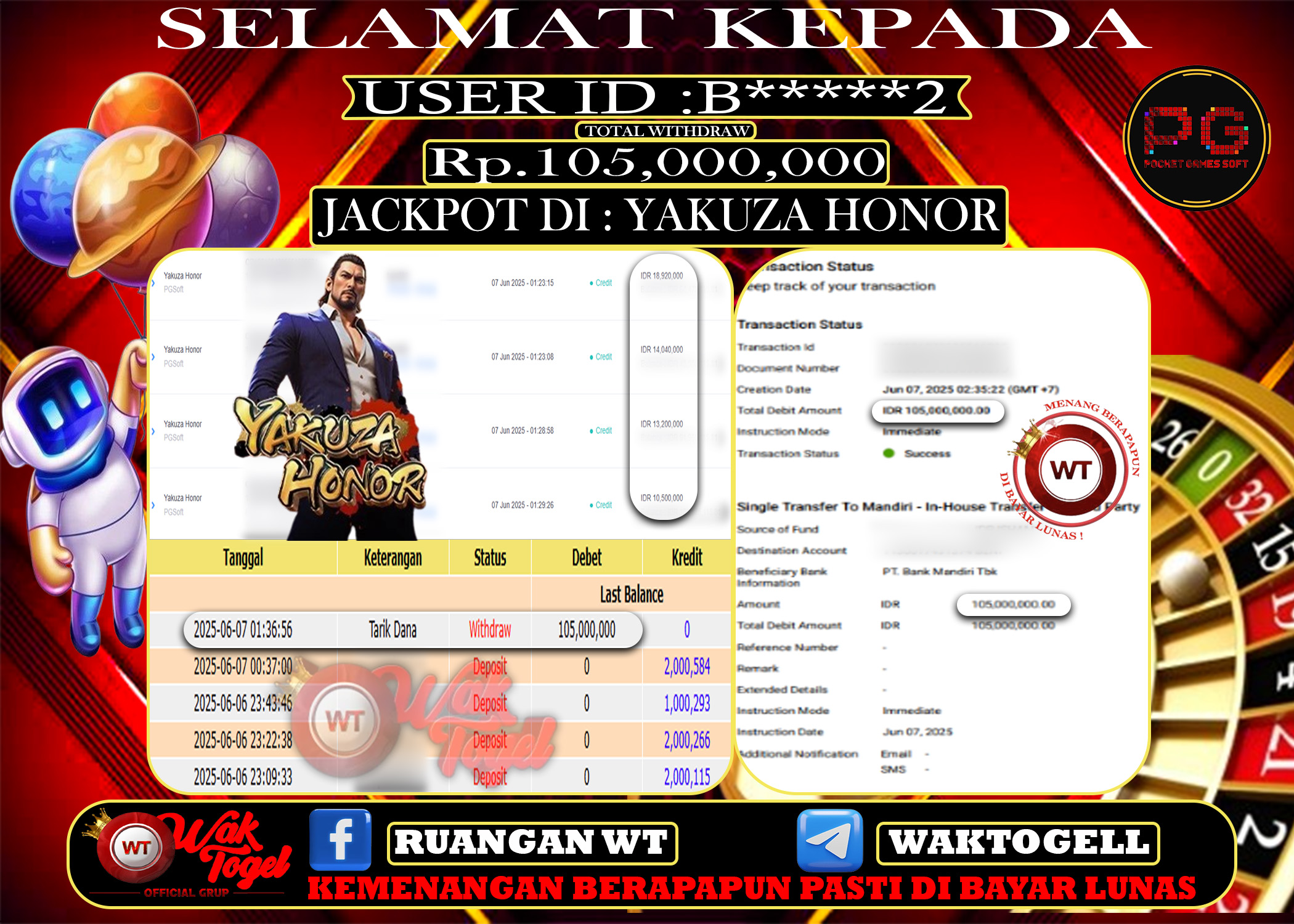 BUKTI PEMBAYARAN SLOT WAKTOGEL RP. 105,000,000 – GAME : SLOT YAKUZA HONOR (USER ID : B*****2) TANGGAL |07-06-2025| CASH LUNAS !