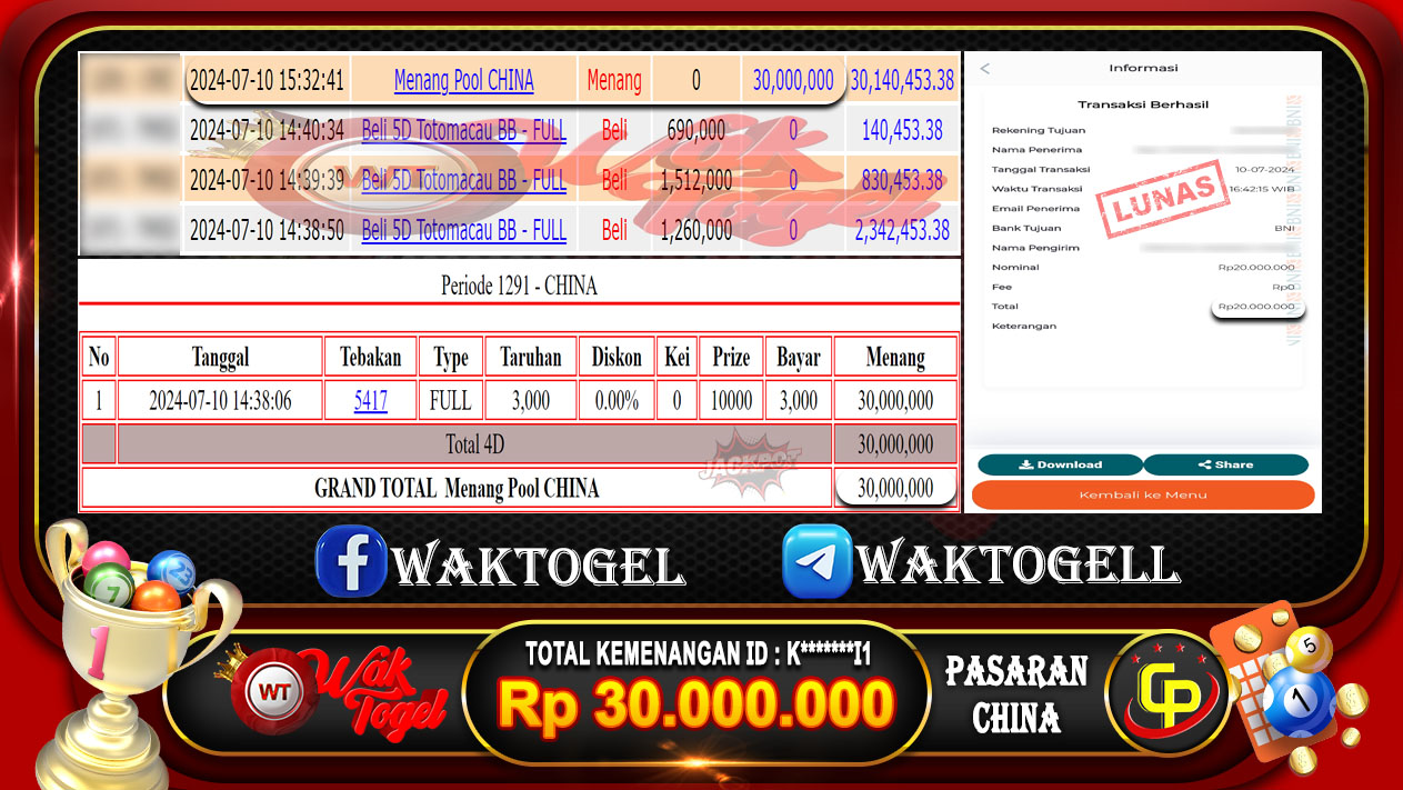 BUKTI PEMBAYARAN CHINA WAKTOGEL BUKTI PEMBAYARAN CHINA WAKTOGEL RP. 30.000.000 – GAME : TOGEL CHINA POOLS (USER ID : K******I1) TANGGAL |10-07-2024| CASH LUNAS ! […]