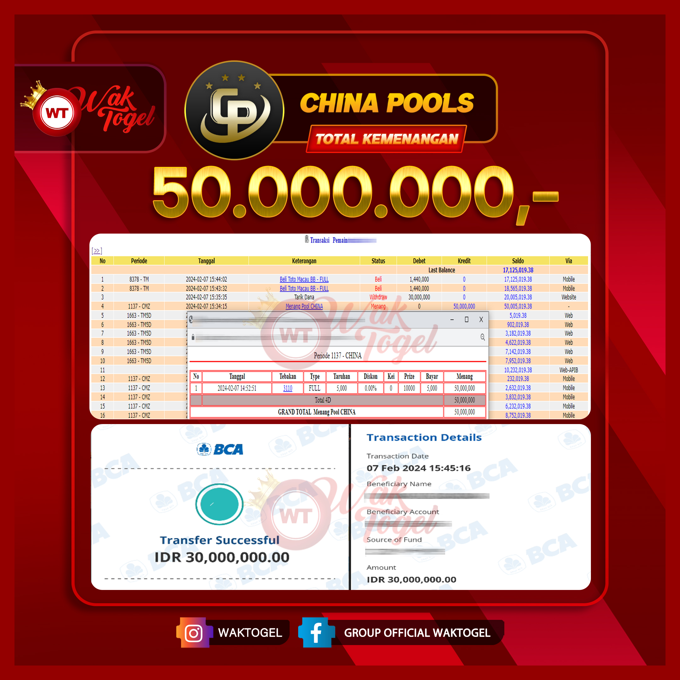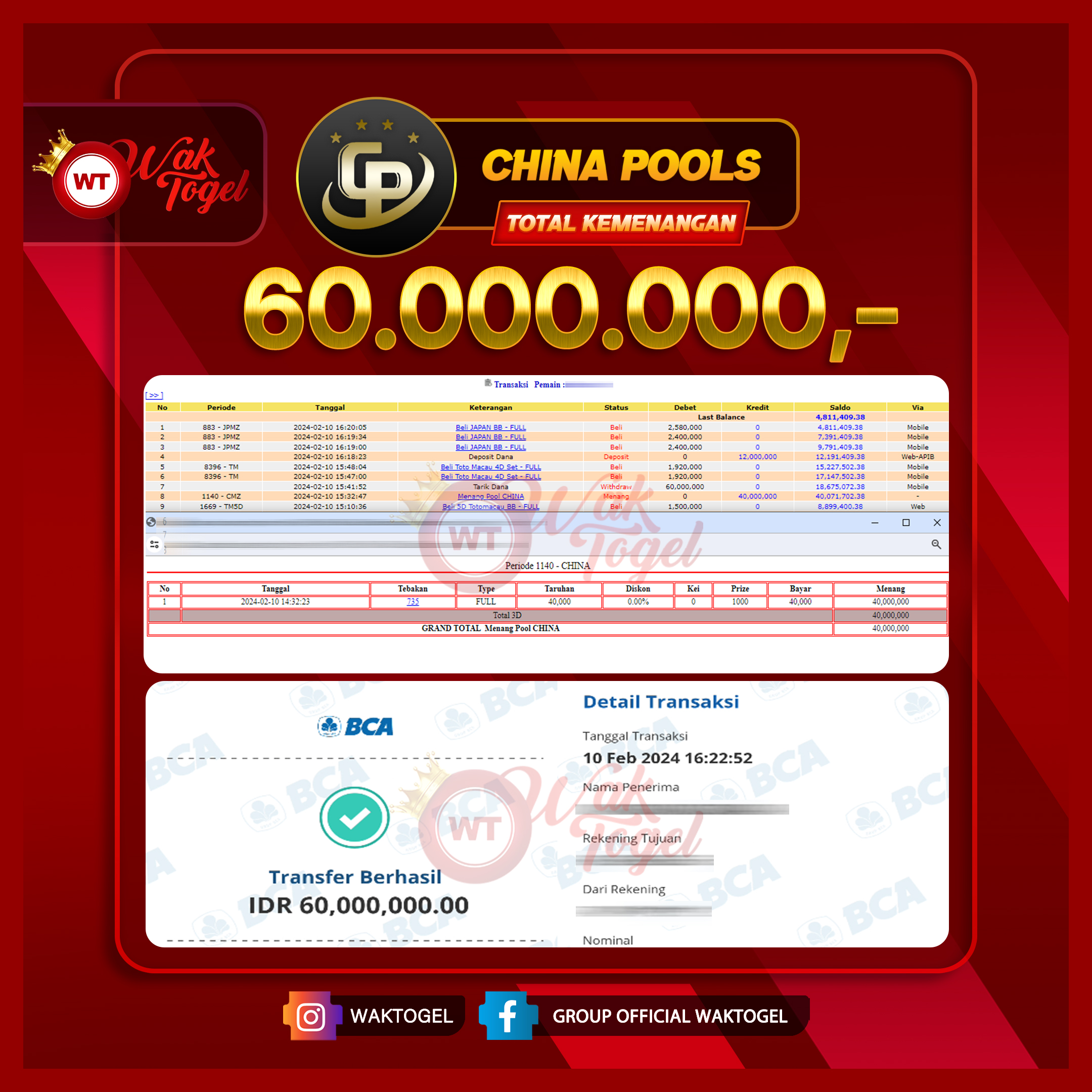 BUKTI PEMBAYARAN CHINA WAKTOGEL BUKTI PEMBAYARAN CHINA WAKTOGEL RP. 60.000.000 – GAME : TOGEL CHINA POOLS TANGGAL (USER ID : K*****1) |10-02-2024| CASH LUNAS ! […]