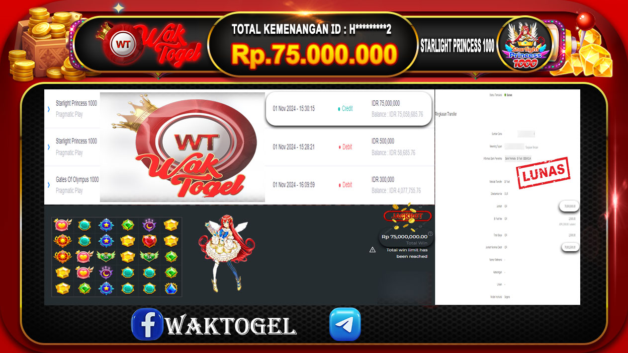 JACKPOT SLOT WAKTOGEL BUKTI PEMBAYARAN SLOT WAKTOGEL By JPWT November 1, 2024 0 comments 2 min read BUKTI PEMBAYARAN SLOT WAKTOGEL BUKTI PEMBAYARAN SLOT WAKTOGEL RP. 75.000.000 – GAME : SLOT STARLIGHT PRINCESS 1000 (USER ID : H********2) TANGGAL |01-11-2024| CASH LUNAS […]