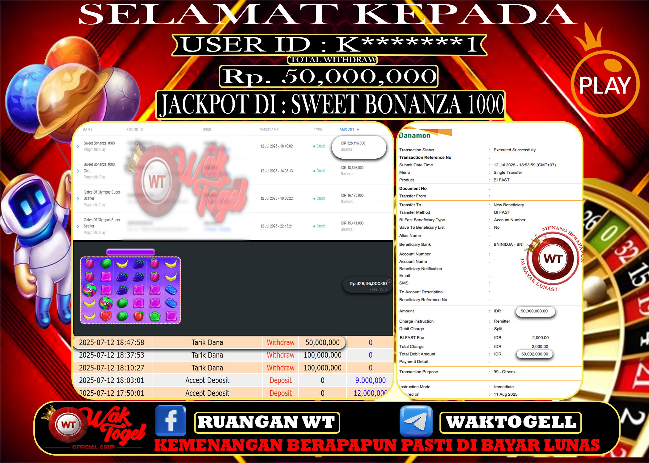 JACKPOT SLOT WAKTOGEL BUKTI PEMBAYARAN SLOT WAKTOGEL By JPWT Juli 10, 2025 0 comments 2 min read BUKTI PEMBAYARAN SLOT WAKTOGEL BUKTI PEMBAYARAN SLOT WAKTOGEL RP. 95,000,000 – GAME : SLOT SWEET BONANZA 1000 (USER ID : G*****2) TANGGAL |09-07-2025| CASH LUNAS […]