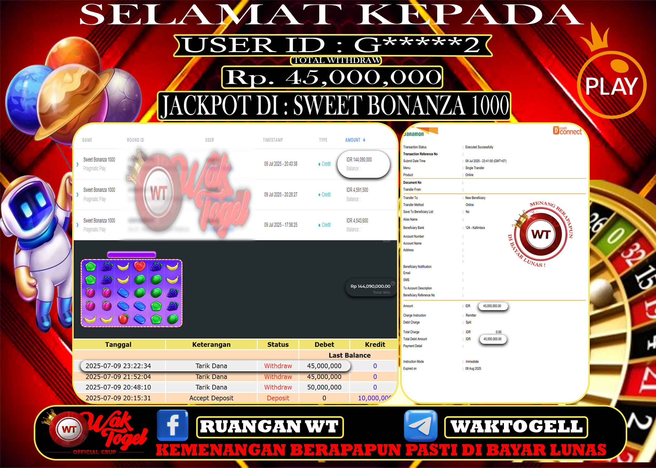 JACKPOT SLOT WAKTOGEL BUKTI PEMBAYARAN SLOT WAKTOGEL By JPWT Juli 10, 2025 0 comments 2 min read BUKTI PEMBAYARAN SLOT WAKTOGEL BUKTI PEMBAYARAN SLOT WAKTOGEL RP. 45,000,000 – GAME : SLOT SWEET BONANZA 1000 (USER ID : G*****2) TANGGAL |09-07-2025| CASH LUNAS […]