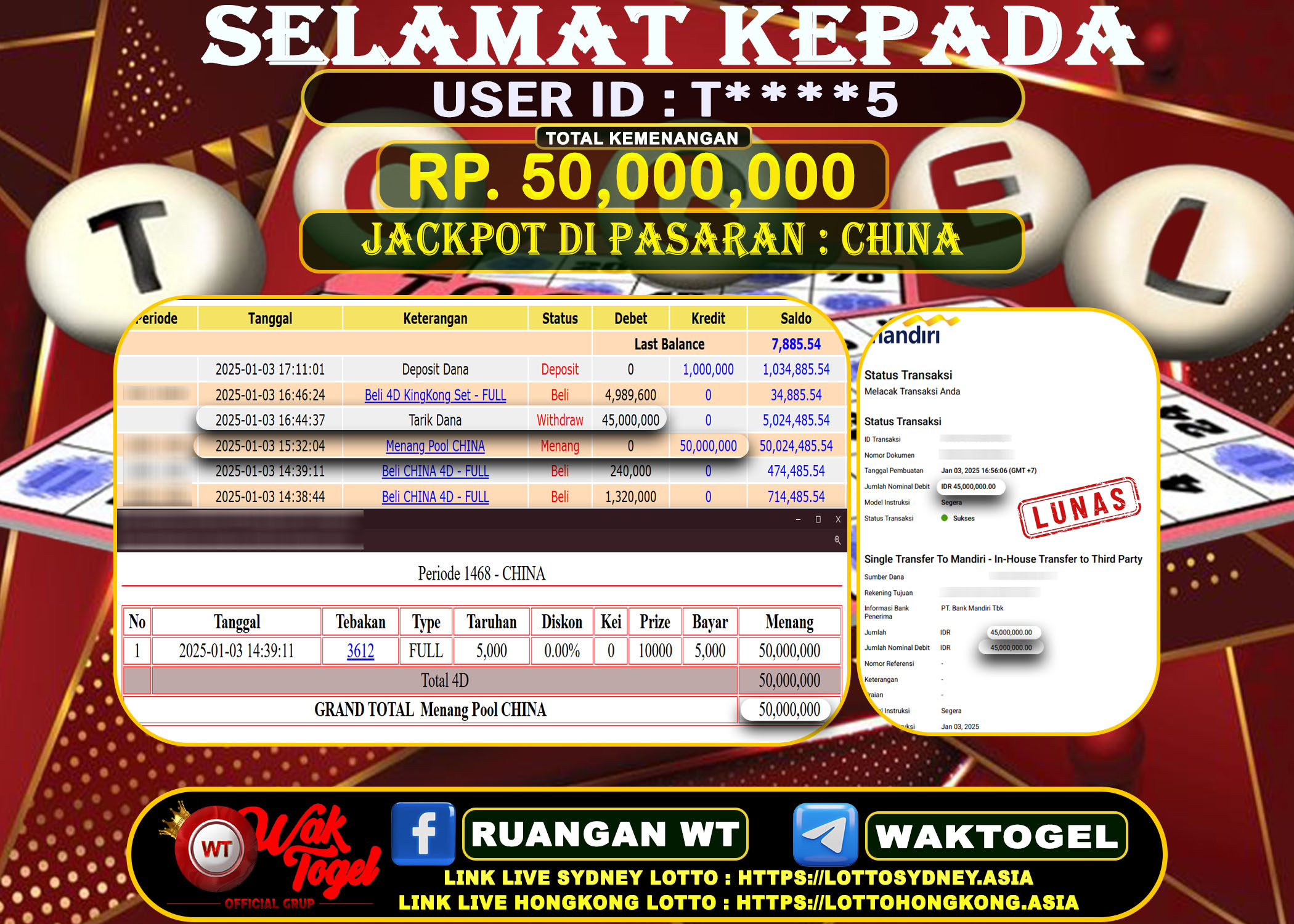 BUKTI PEMBAYARAN CHINA WAKTOGEL BUKTI PEMBAYARAN CHINA WAKTOGEL RP. 110,000,000 – GAME : TOGEL CHINA POOLS (USER ID : K*******1) TANGGAL |28-01-2025| CASH LUNAS ! […]