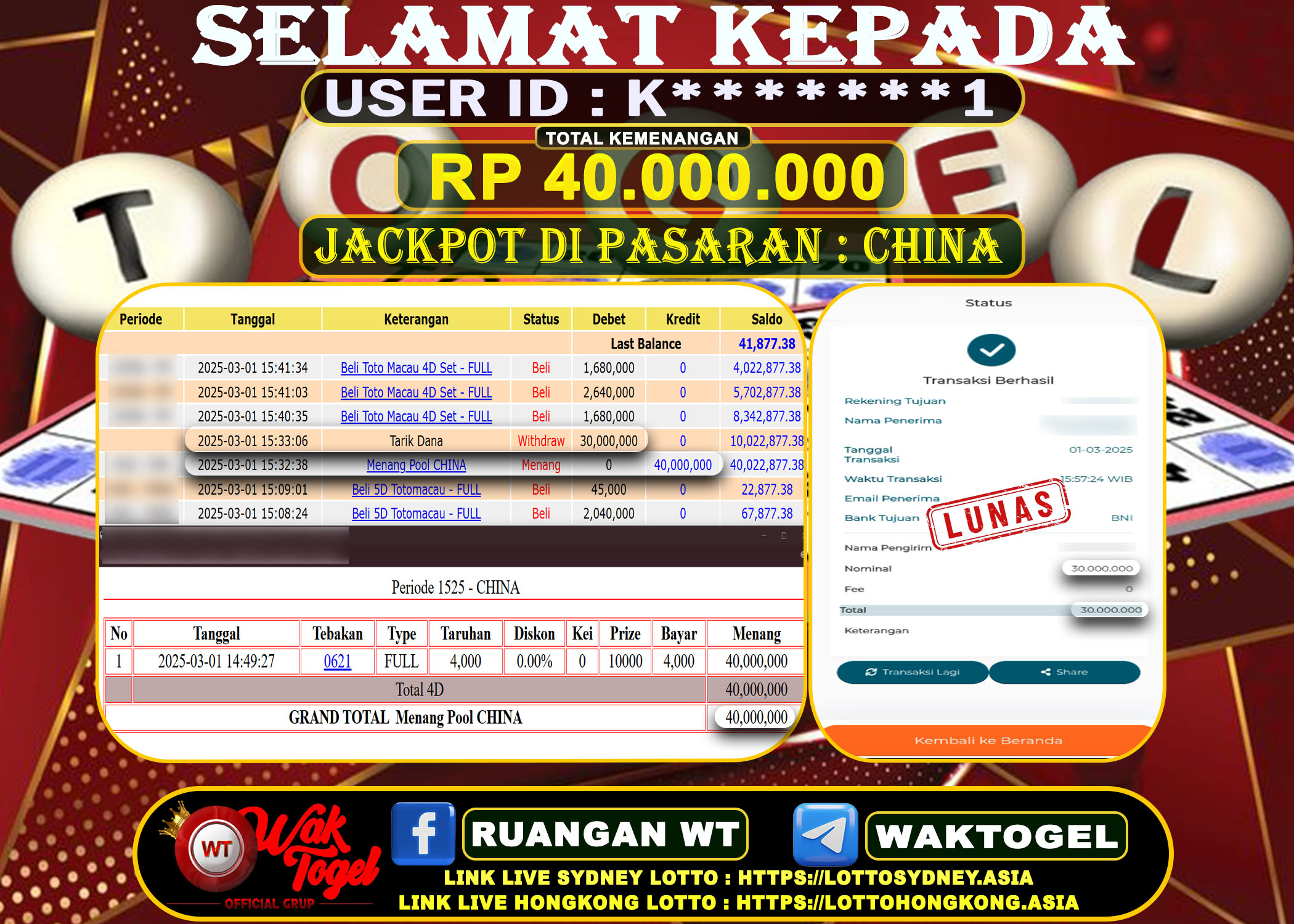 BUKTI PEMBAYARAN CHINA WAKTOGEL BUKTI PEMBAYARAN CHINA WAKTOGEL RP. 60,000,000 – GAME : TOGEL CHINA POOLS (USER ID : K*******1) TANGGAL |10-02-2025| CASH LUNAS ! […]