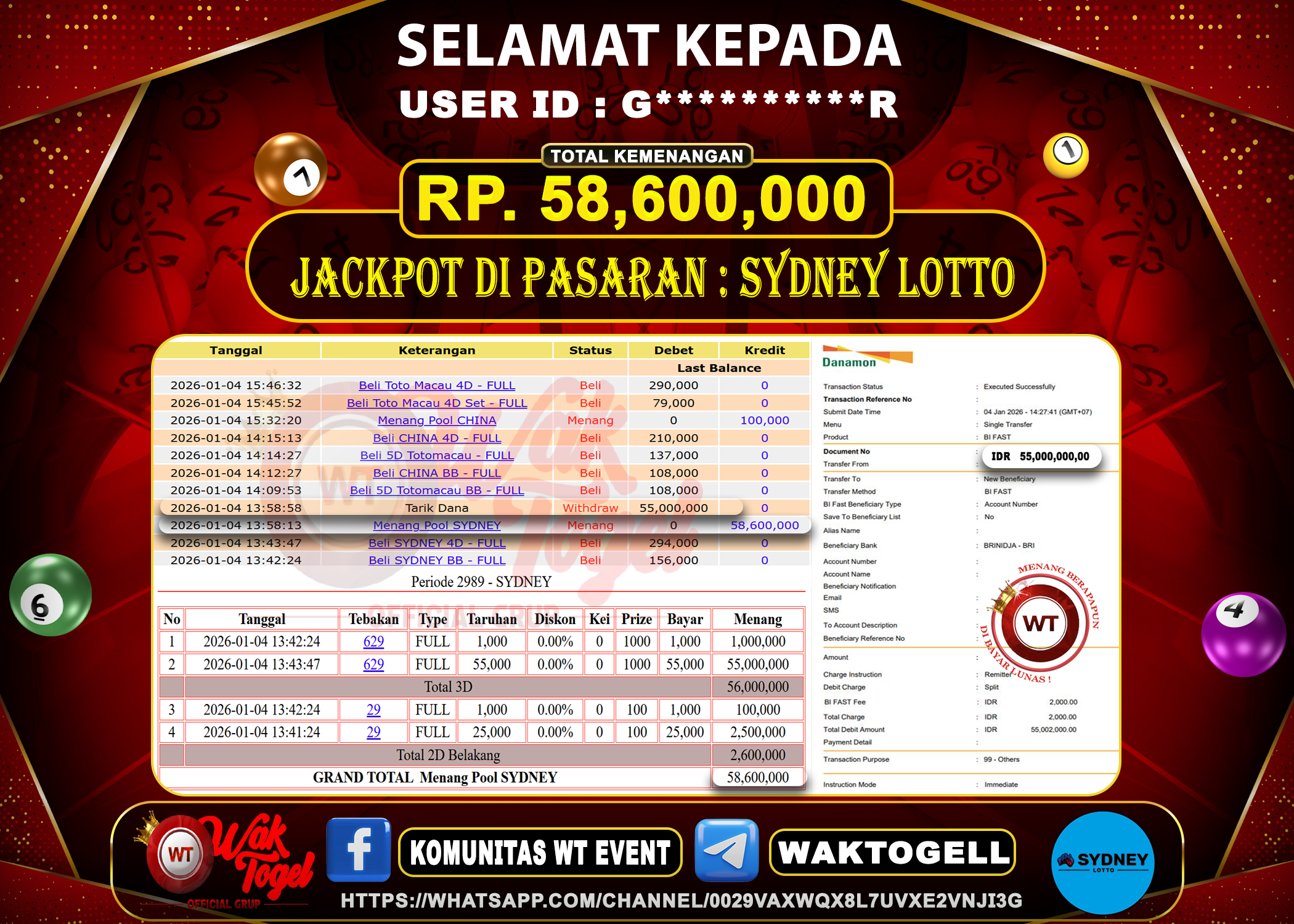 BUKTI PEMBAYARAN SYDNEY WAKTOGEL BUKTI PEMBAYARAN SYDNEY LOTTO WAKTOGEL RP. 58.600.000 – GAME : TOGEL SYDNEY LOTTO POOLS (USER ID : G**********R) TANGGAL |04-01-2026| CASH […]