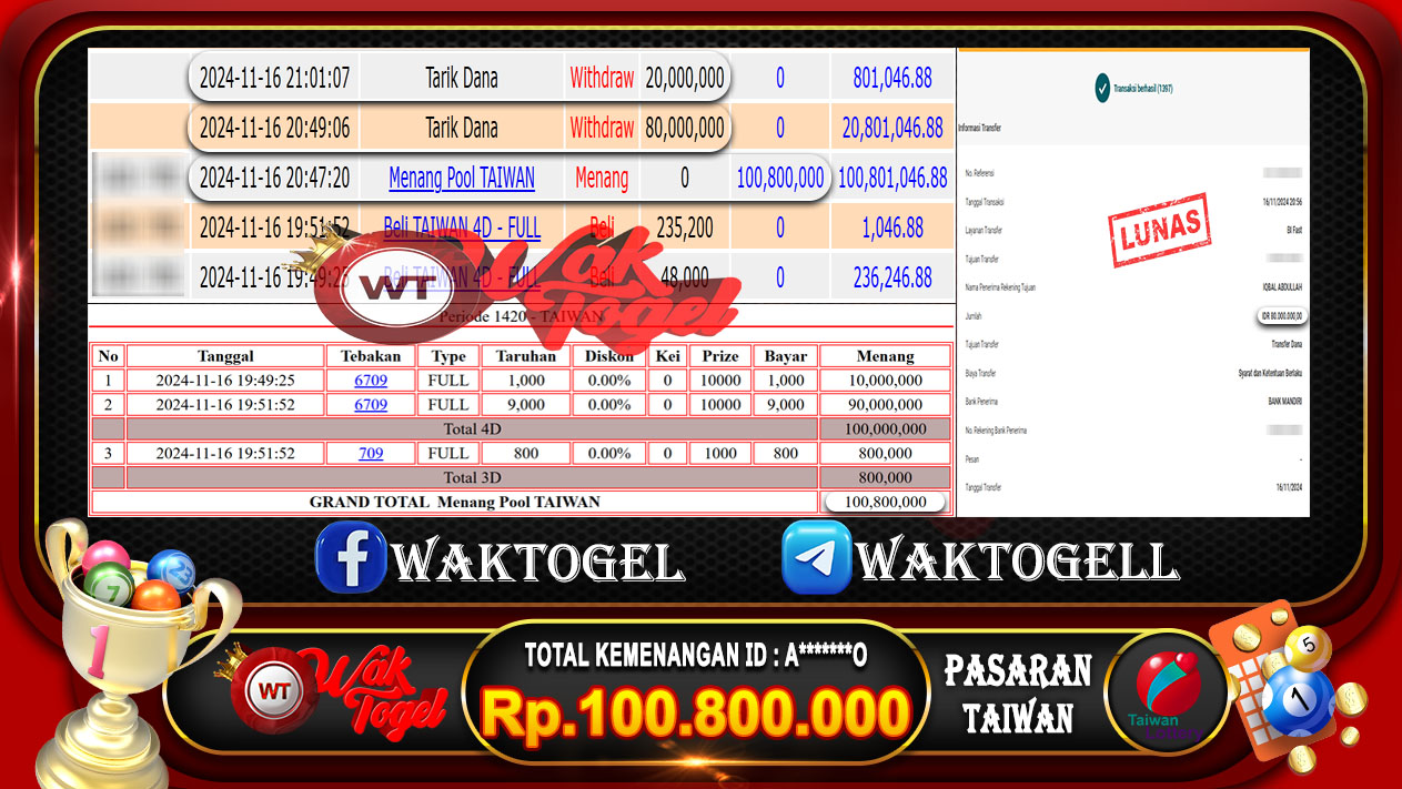 BUKTI PEMBAYARAN TAIWAN WAKTOGEL BUKTI PEMBAYARAN TAIWAN WAKTOGEL RP. 100.800.000 – GAME : TOGEL TAIWAN POOLS  (USER ID : A*******O)TANGGAL|16-11-2024| CASH LUNAS ! Kami ucapkan […]